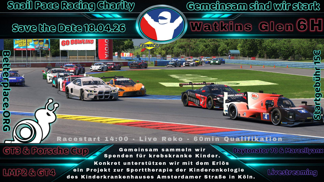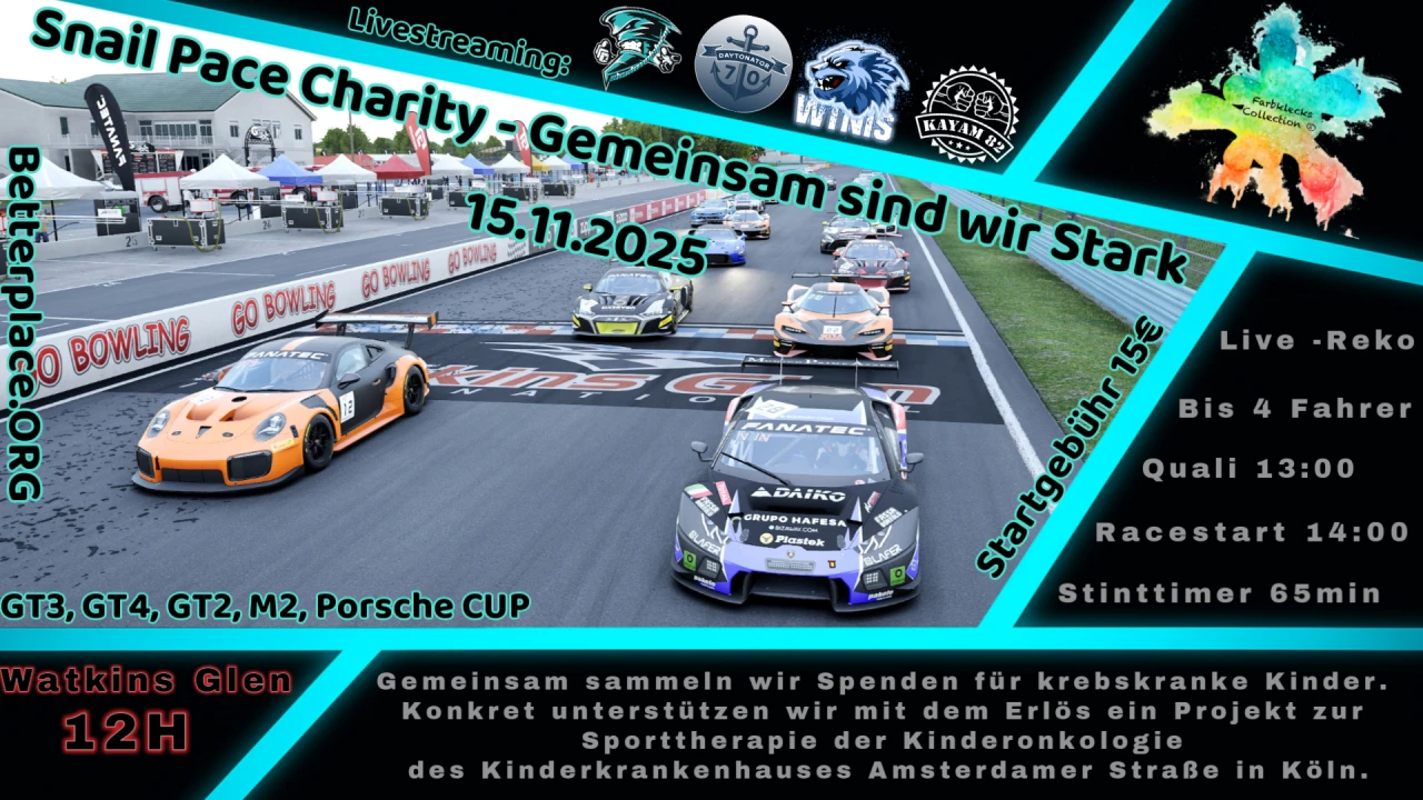 Am 15.11.2025 veranstaltet Snail Pace Racing ein Charity-Event: 12 Stunden Multiclass-Aktion (GT3, GT4, M2, Porsche CUP) auf Watkins Glen.