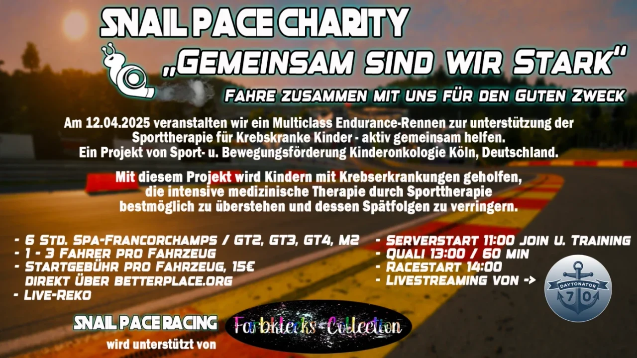 Am 12.04.2025 veranstaltet Snail Pace Racing ein Charity-Event der Extraklasse: 6 Stunden Multiclass-Aktion (GT3, GT4, M2) auf Spa.